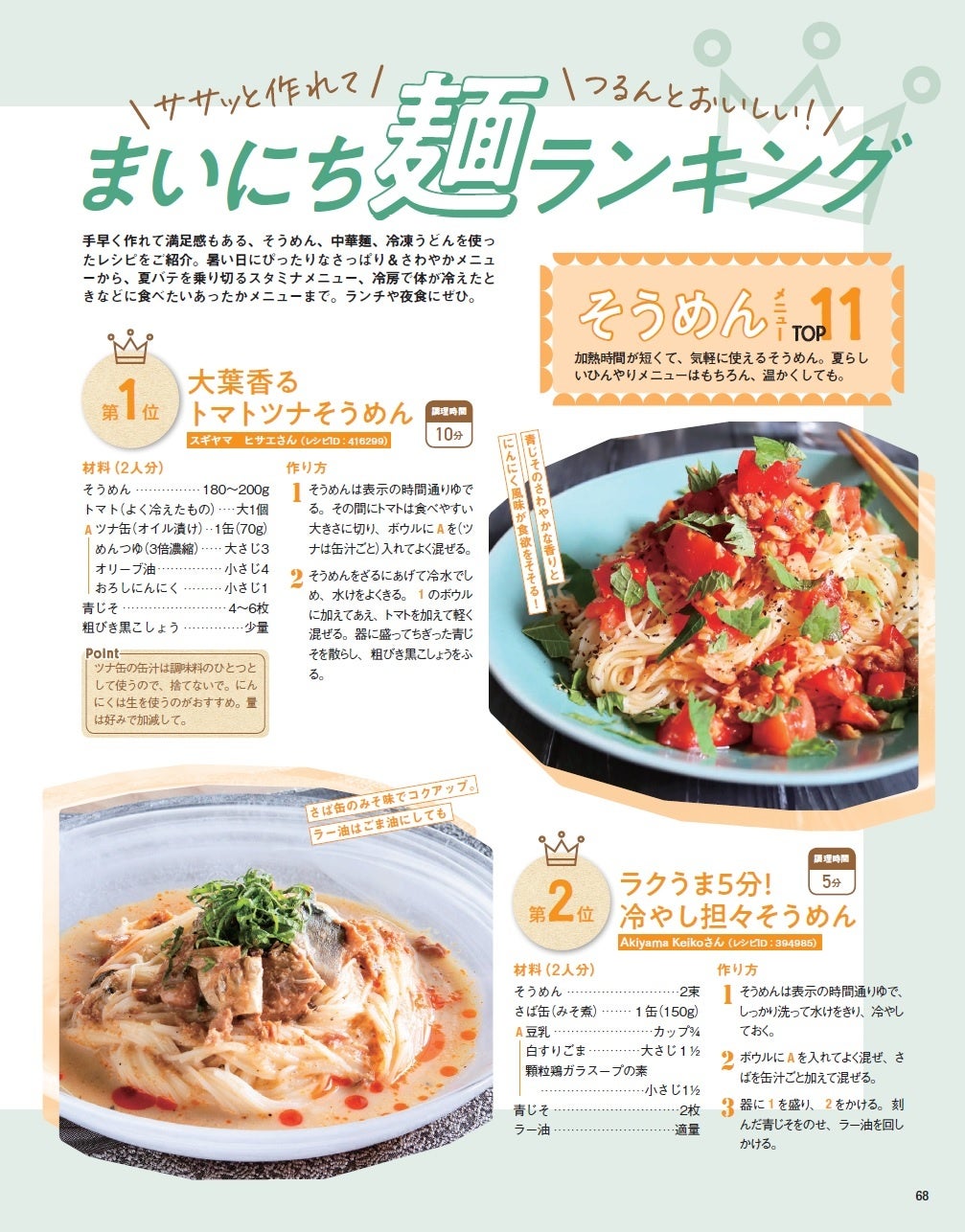 そのほか、夜ごはんにはもちろん、休日のお昼ごはんなどにも活躍するめん類レシピを提案。そうめん、中華めん、冷凍うどんの人気レシピを紹介します。1皿だけでも満足感があるレシピばかりなので、料理がめんどう! という日にも役立ってくれます。