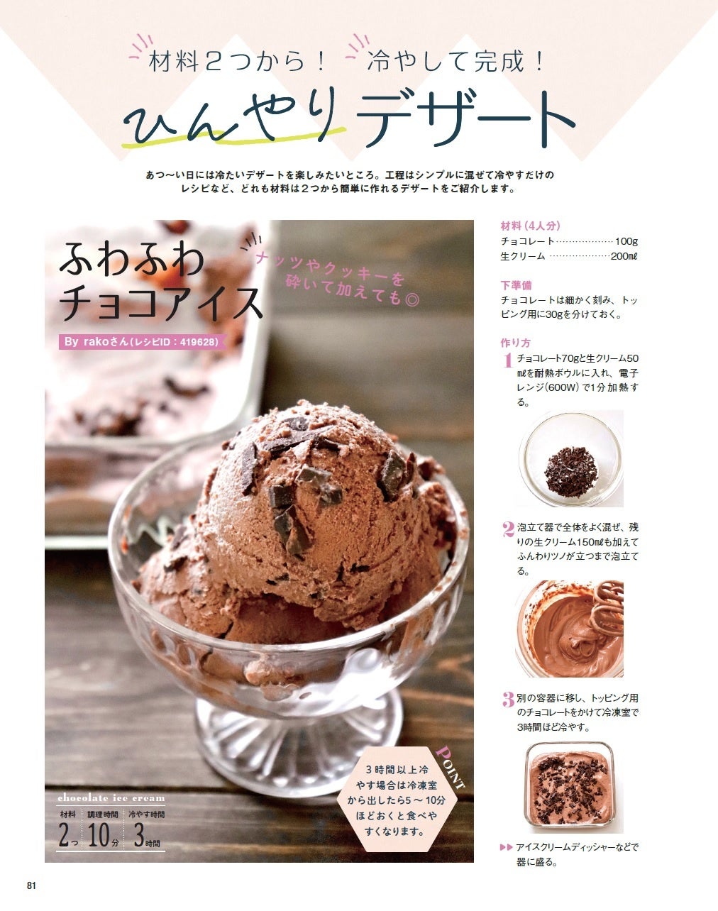 そのほか、冷やし固めるだけでできるスイーツレシピも掲載しています。少ない材料でできるものばかりで、なんと材料2つだけでできるものもあります。スイーツづくりにもぜひチャレンジしてください。