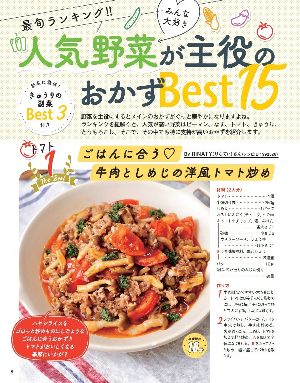 巻頭特集は「人気野菜が主役のおかず」のランキング。最新ランキングをもとに、Nadiaユーザーが本当に評価したレシピから15品を厳選しました。失敗知らずのピーマンの肉詰めなど、必見のレシピが満載です。