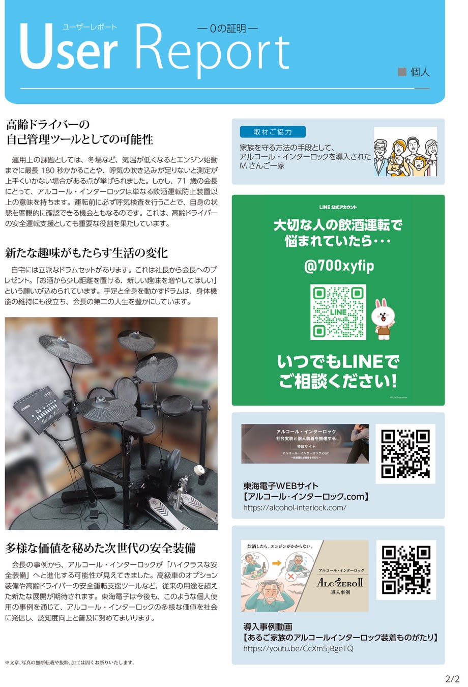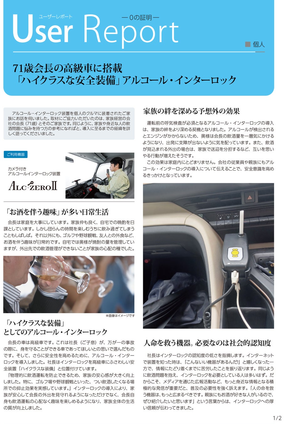 今回公開したレポートでは、"お酒を伴う趣味"の多い71歳の父親を持つご家族が、高級車に「ハイクラスな安全装備」としてアルコールインターロックを導入した経緯や、その後の変化について詳しく紹介しています。