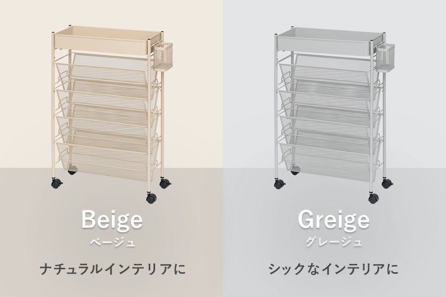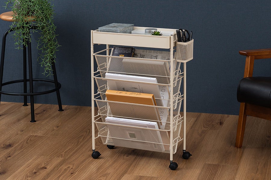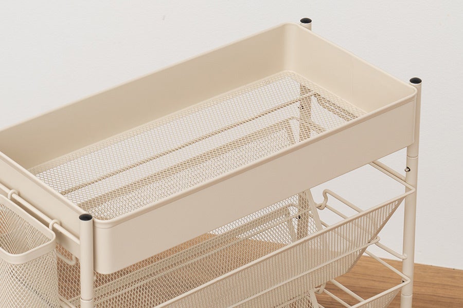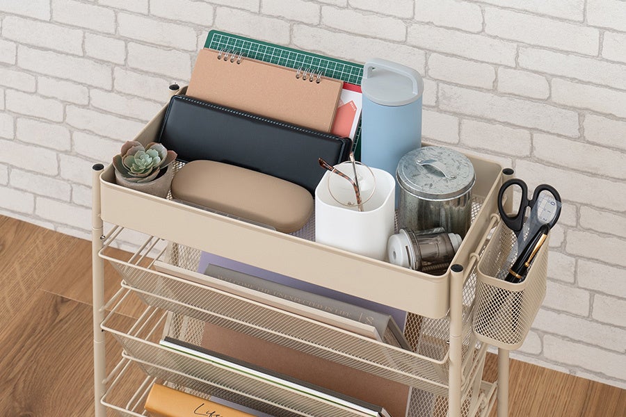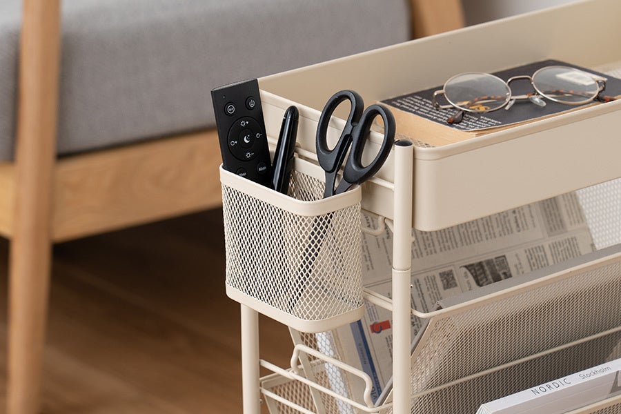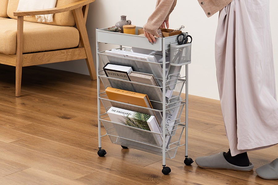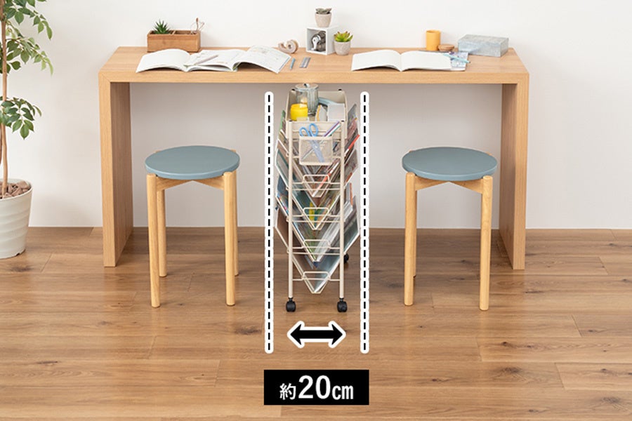 スリムタイプのラックを隙間やテーブル下に置けば収納スペースに早変わり。天面にバスケットを付けて収納力がさらにアップ。