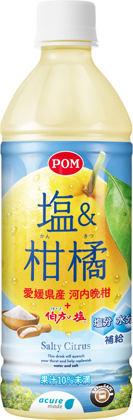 「塩&柑橘」は、愛媛県産河内晩柑果汁と「伯方の塩」を使用した「塩分・水分補給」をサポートする熱中症対策飲料です。柑橘といえば、代表的なみかんやゆずなど、冬をイメージする方も多いのではないでしょうか。河内晩柑(かわちばんかん)は4月から7月にかけて収穫できる、黄色くて大きな果実が特徴の柑橘です。本商品はそんな河内晩柑果汁のすっきりとした甘さと後味にほのかに感じる塩味が特徴で、塩を入れることで水分だけでなく、塩分補給もできる一品です。