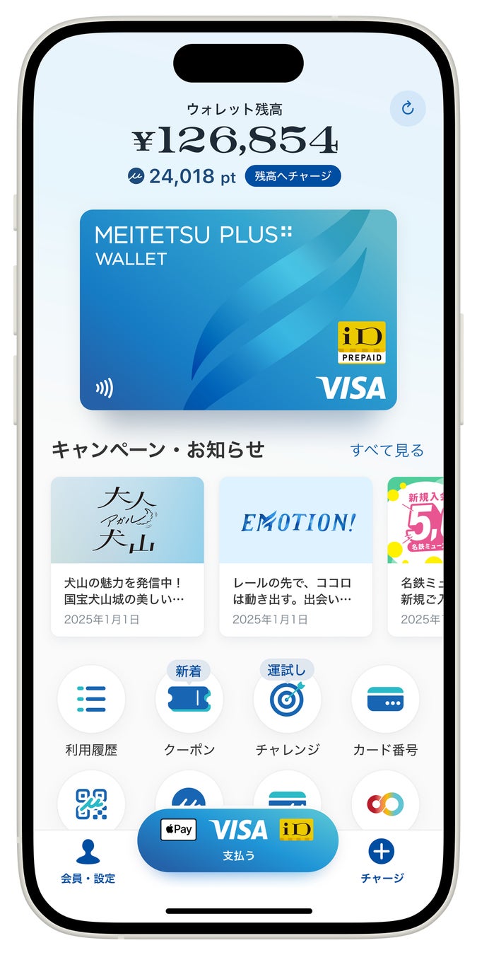 「MEITETSU PLUS」内サービスとして、「MEITETSU PLUS WALLET」を提供します。これは、三井住友カード株式会社が提供する「モバイル決済パッケージ」を導入し、事前チャージによるスマートフォンでのVisa・iD加盟店でのタッチ決済や、バーチャルプリペイドカードでのオンライン決済(Visaの加盟店)を可能にする、チャージと決済が一体となったもので、店舗やオンラインでの日々のお買物をより便利にご利用いただけます。