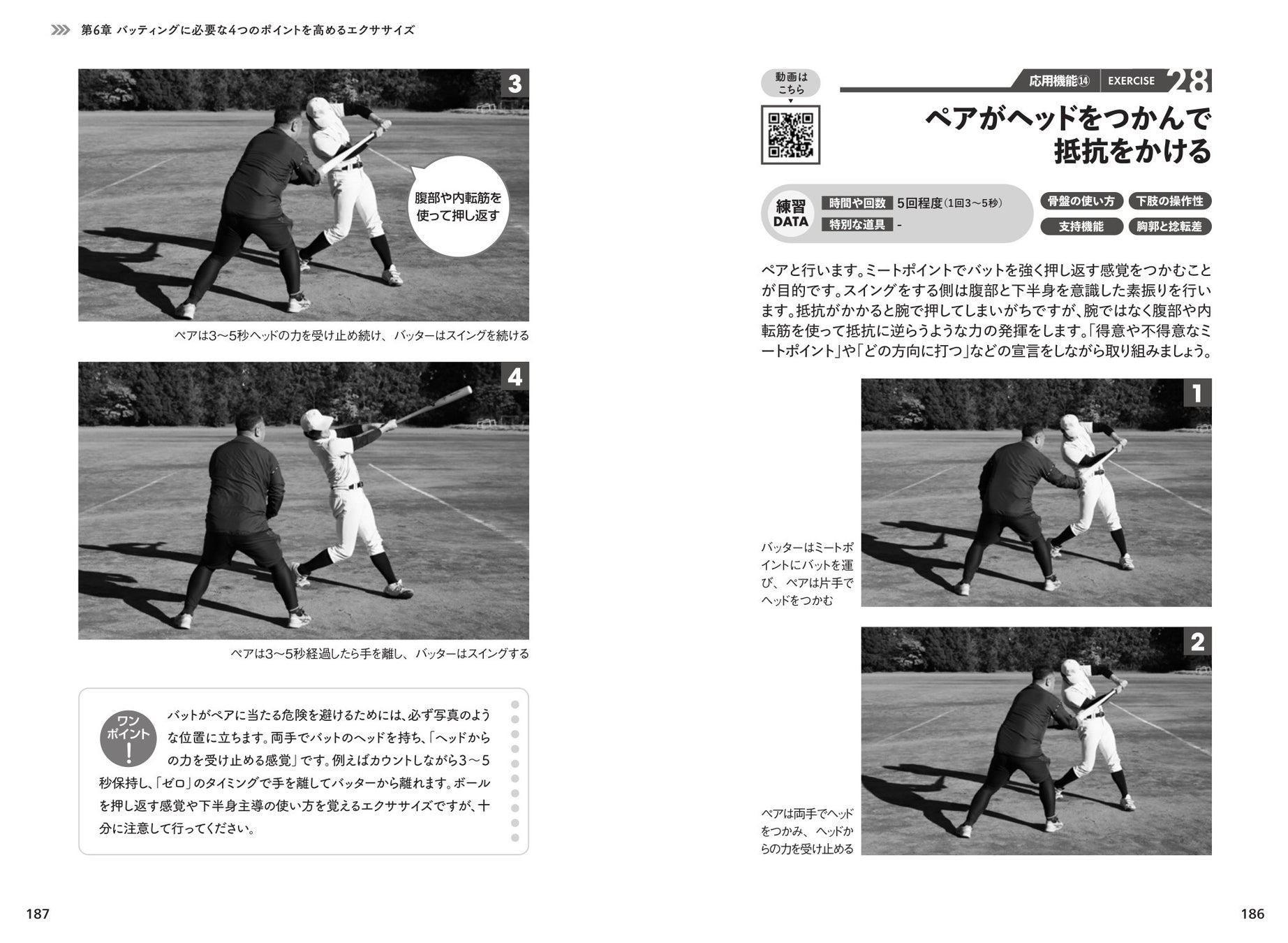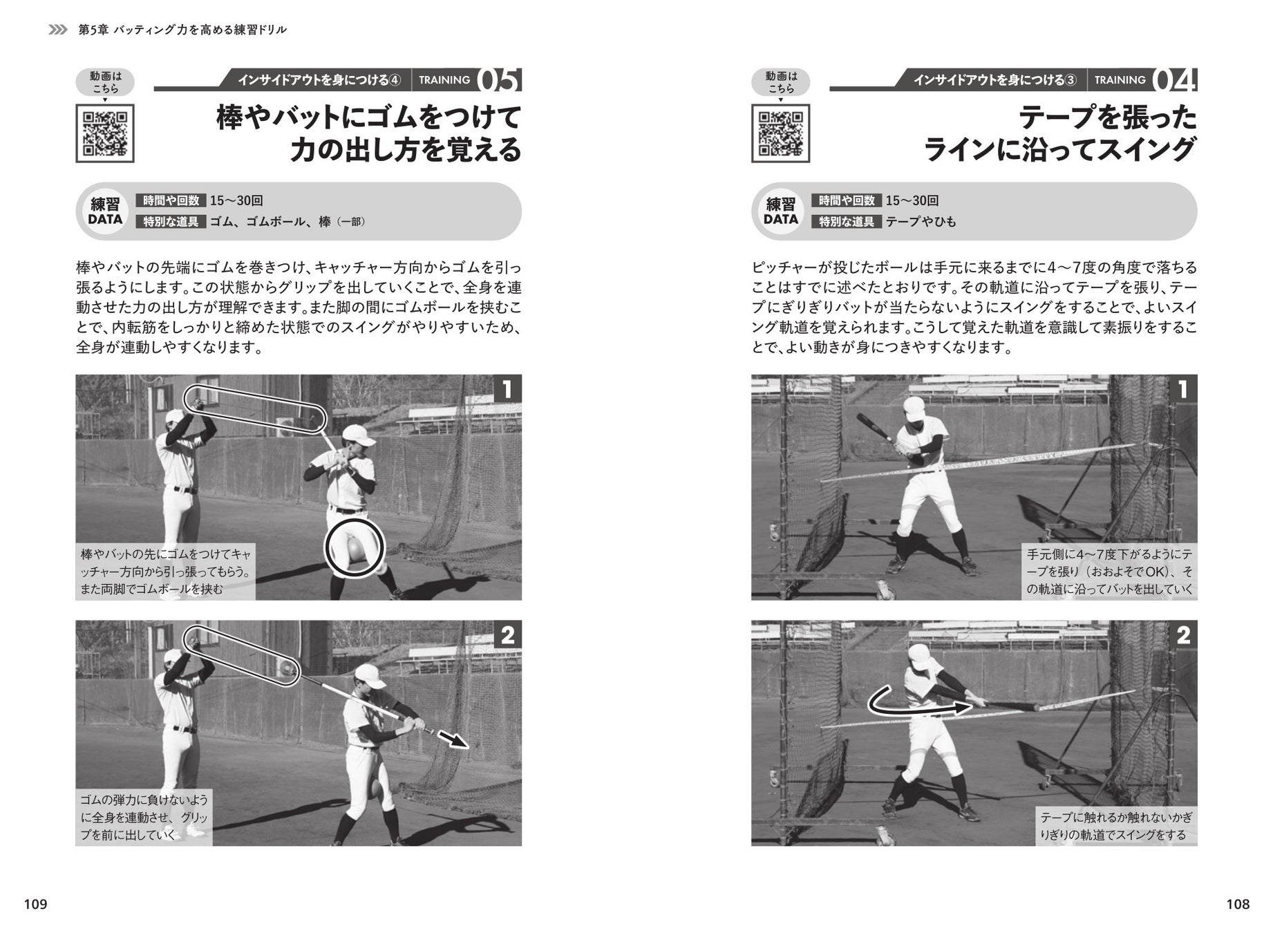 川村氏による「インサイドアウトを身につける」「スイング力を上げる」「変化球&ファウルの打ち方をつかむ」などの練習ドリル、また、数々のプロ選手のパーソナルトレーナーを務めた井脇氏はバッティングに必要な4ポイント「骨盤の使い方」「下肢の操作性」「支持機能」「胸郭と捻転差」を強化するトレーニングを紹介。すべてのトレーニングにQR動画がついているので、リアルな動きを動画で確認することができます。