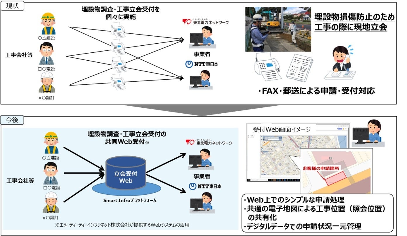 この度、連携協定の一環として、東北電力NWおよびNTT東日本 宮城事業部は、現在両社が個々に実施している、工事会社様等からの依頼に基づく埋設物調査・工事立会受付について、エヌ・ティ・ティ・インフラネット株式会社 以下「NTTインフラネット」が提供する「立会受付Webシステム※1」を活用し、共同受付する取り組みを、11月1日より開始いたします。