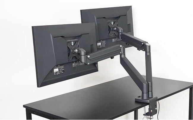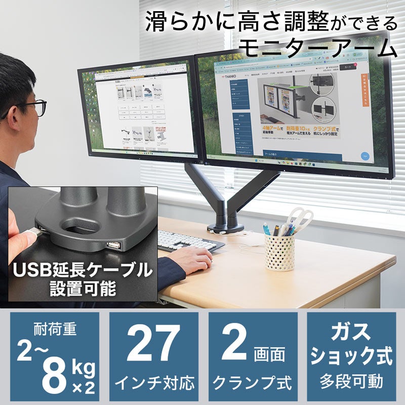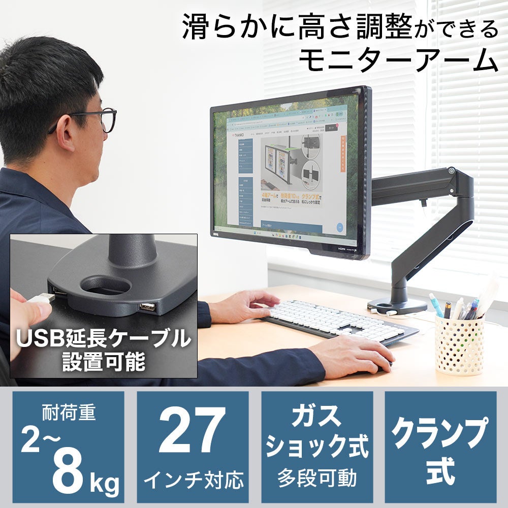 工具を使わずに高さ調整ができる、USB延長ケーブル設置可能なガスショック式モニターアームが登場。シングルタイプとデュアルタイプを用意。