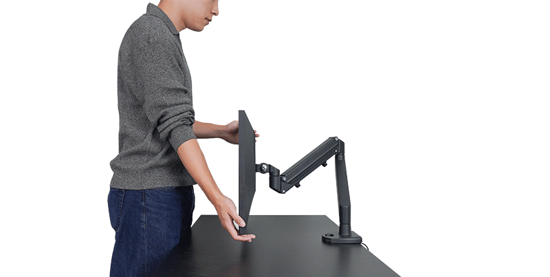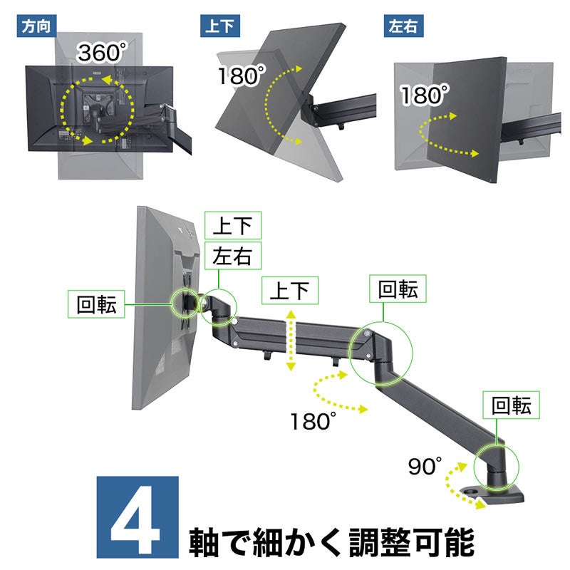 4軸アームがモニターを自在に動かし、お好みの角度や位置でモニターを固定できます。