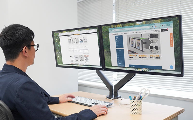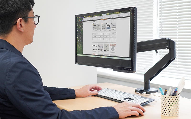 工具不要でスムーズにモニターの高さや角度、位置が調整できる『モニターアームプレミアム(ガスショック式)シングルタイプ・デュアルタイプ』を発売