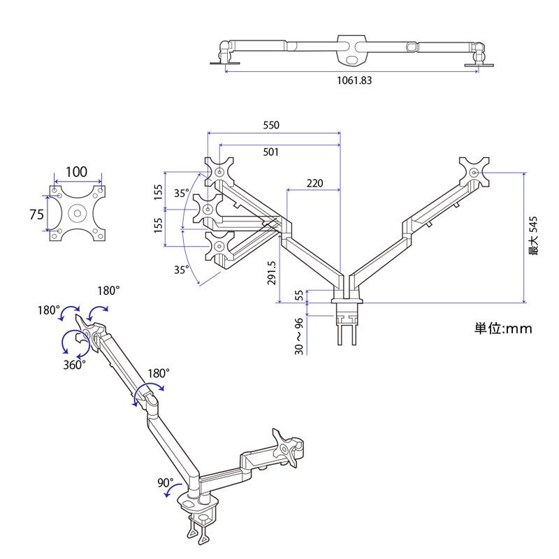・セット内容/モニターアーム本体、クランプ部、六角レンチ(大・小)、ボルト(M4×10)8本、ボルト(M8×12)2本、組立説明書