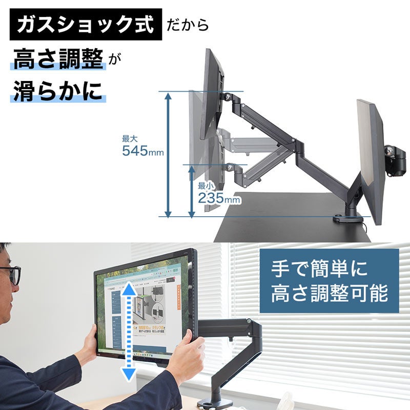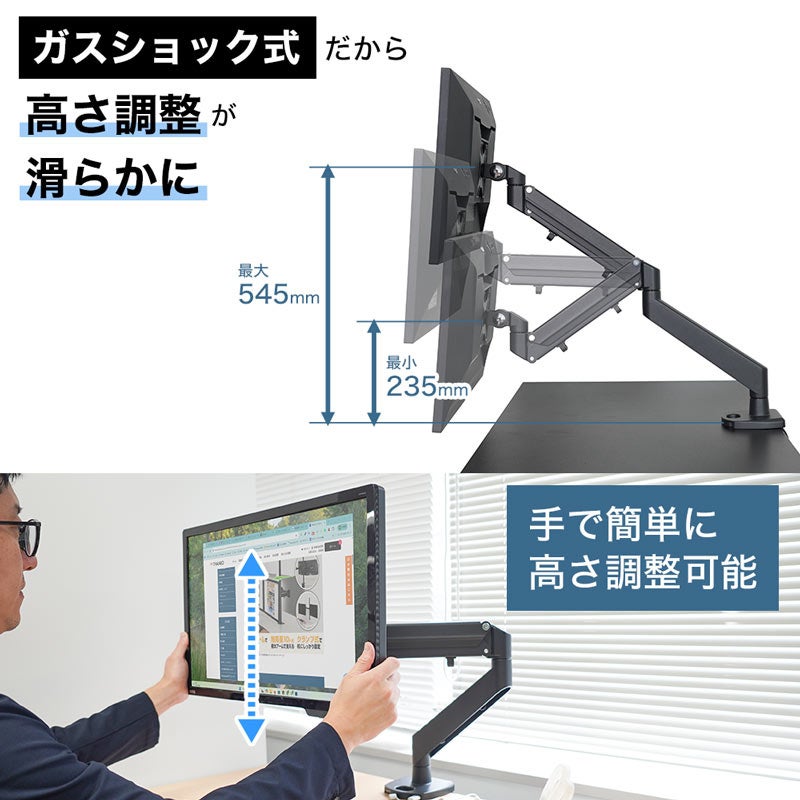 本製品は、工具不要でスムーズな高さ調整が可能な、ガスショック式のモニターアームです。