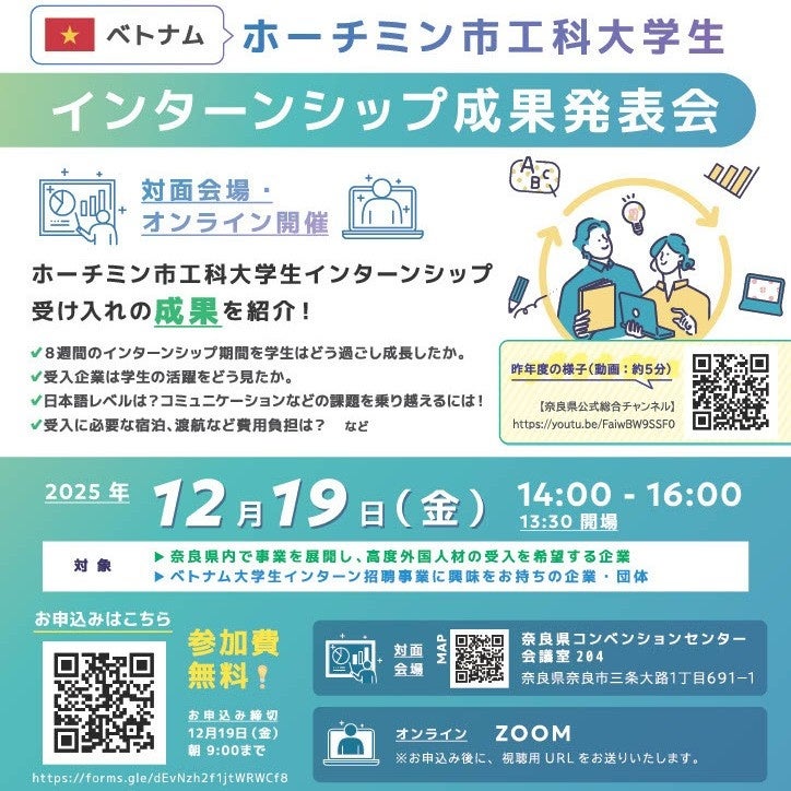 奈良県では、高度外国人材の受入体制づくりや社内の活性化の促進を図るため、県内企業とベトナム・ホーチミン市工科大学の学生を対象に、8週間程度のインターンシップの機会を提供しています。