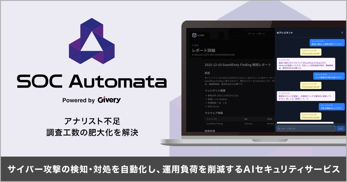 AI・サイバーセキュリティに関するコンサルティング・開発支援を行う株式会社ギブリー(本社:東京都渋谷区、代表取締役社長:井手 高志、以下当社)は、SOC(Security Operation Center:企業のネットワークを監視し、サイバー攻撃を検知・対処する専門チーム)の業務を自動化し、運用負荷を大幅に削減するAIセキュリティサービス「SOC Automata(SOC オートマタ)」のβ版をリリースいたします。