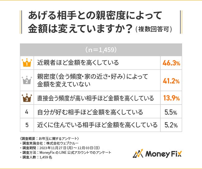 相手との親密度と金額の関係については、「近親者ほど金額を高くしている」(46.3%)が最も多く、「親密度(会う頻度・家の近さ・好み)によって金額を変えていない」(41.2%)、「直接会う頻度が高い相手ほど金額を高くしている」(13.9%)と続きました。