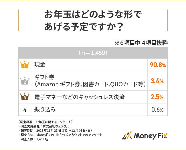 「現金」(90.8%)が多い結果となりました。「電子マネーなどのキャッシュレス決済」(2.5%)はかなり少ないことから、これだけキャッシュレス決済が普及したいまもなお、お年玉は現金であげるのが一般的であることがわかります。