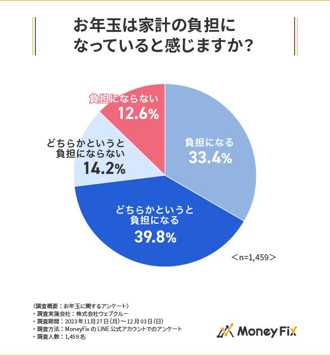 お年玉が家計の負担になっているかについては、「負担になる」(33.4%)、「どちらかというと負担になる」(39.8%)という結果でした。負担を感じている人が7割以上いることがわかります。