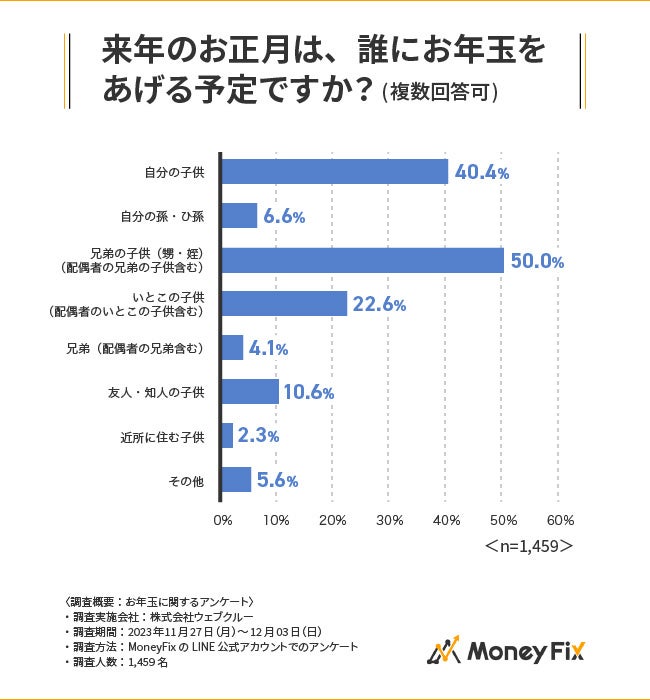 誰にお年玉をあげるのか聞いたところ、「兄弟の子供(甥・姪)」(50%)が最も多く、「自分の子供」(40.4%)、「いとこの子供」(22.6%)と続きました。