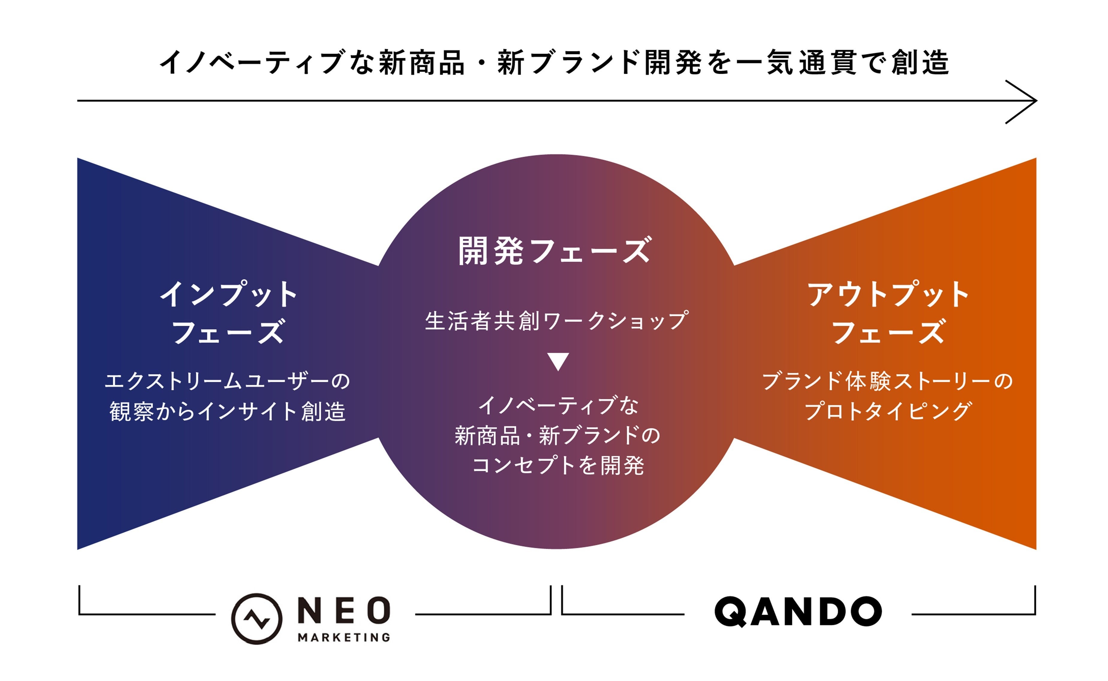 この度、ネオマーケティングとQANDOは「カテゴリーエントリーポイント(CEP)」の有効性を解説した共催ウェビナー(2023年1月31日実施済みhttps://event.neo-m.jp/20230131webinar/)を契機に、お互いのブランド開発におけるアプローチの中心に「デザイン思考」を取り入れている点に注目しました。ネオマーケティングのインサイトを掘り下げる力とQANDOのクリエイティビティを掛け合わせた新サービスを開発することでクライアント様のマーケティングを強力に支援できると考えました。