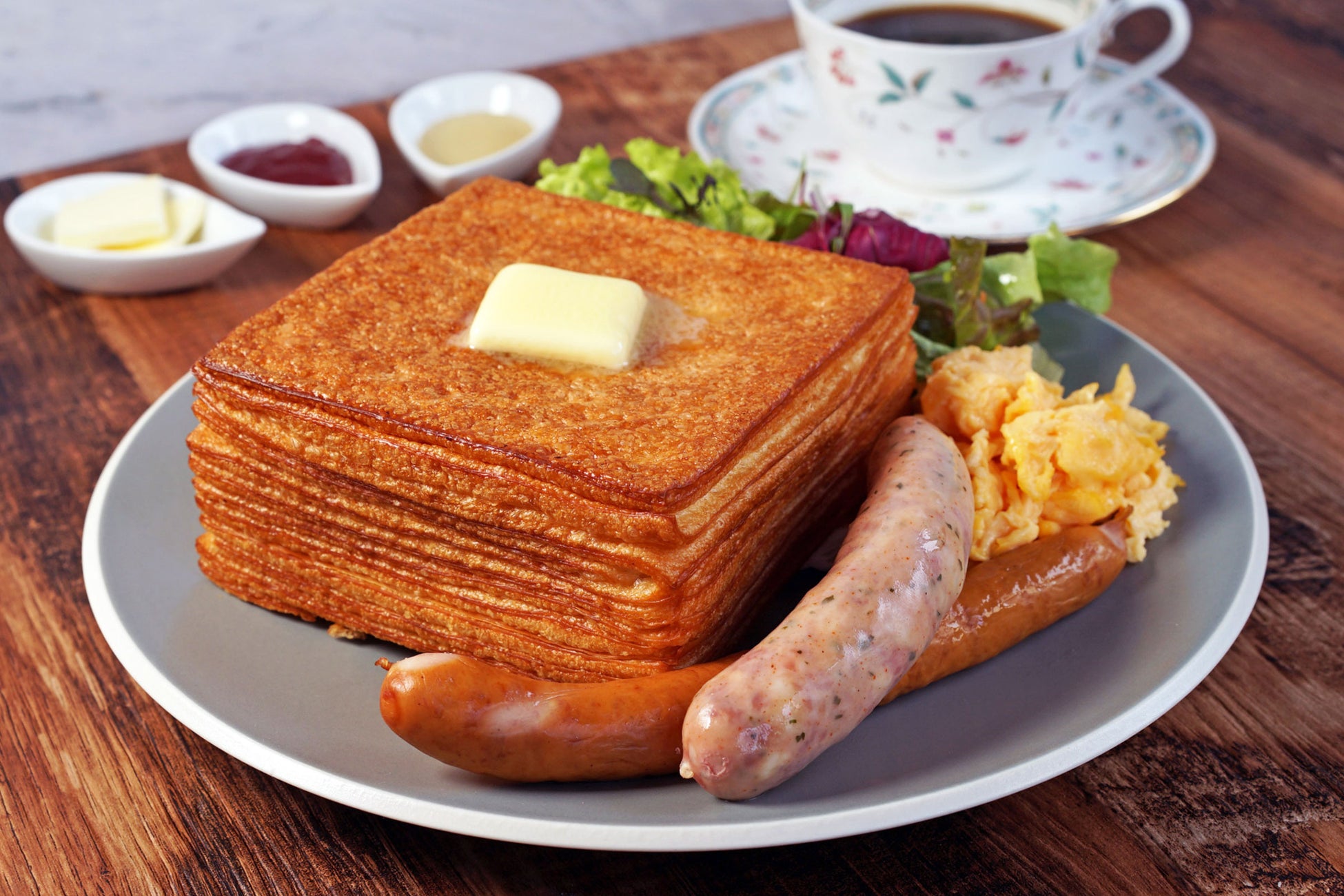 「めくるクロワッサン食パン リーヴル」を最高の状態でお楽しみいただけるよう、店内のオーブンで焼き上げ、トッピングに埼玉県産のはちみつ、バター、ホテルパティシエ手作りのジャムを添え、サラダ、スクランブルエッグ、ハーブソーセージ、スモークソーセージとドリンクをセットにした、ブランチ感覚でお楽しみいただけるセットメニューです。