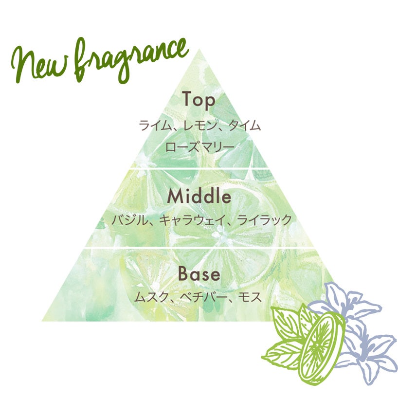 リフレッシュしたい朝や、1日をリセットすっきりと眠りたい夜に。ムスクライム&バジルの香りがやさしく包み込みます。