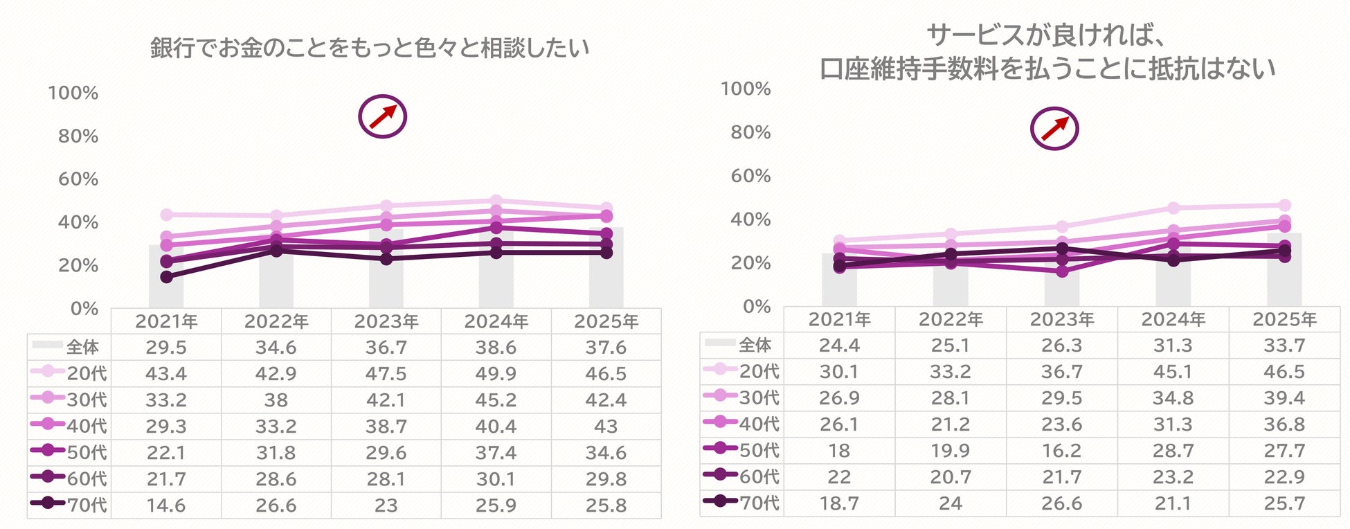 実際に、「銀行でお金のことをもっと色々と相談したい」「サービスが良ければ、口座維持手数料を払うことに抵抗はない」という意識が、すべての年代で2021年より上昇しており、特に若年層はいずれも半数近い回答率となりました。