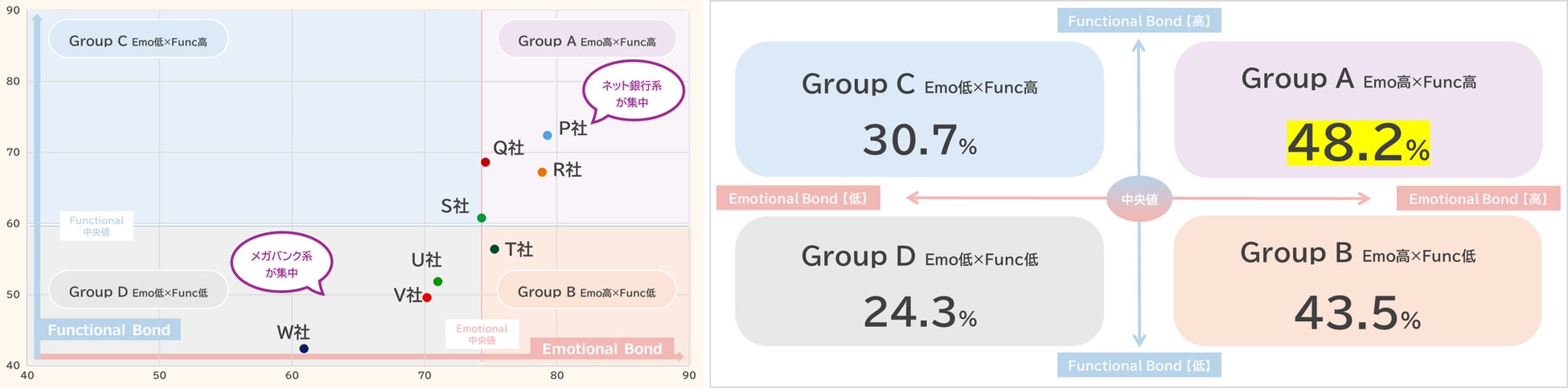 この「Emotional Bond」「Functional Bond」を指標に、調査対象各社の中央値を取り4象限に分類した「EF*マトリクス」を作成。