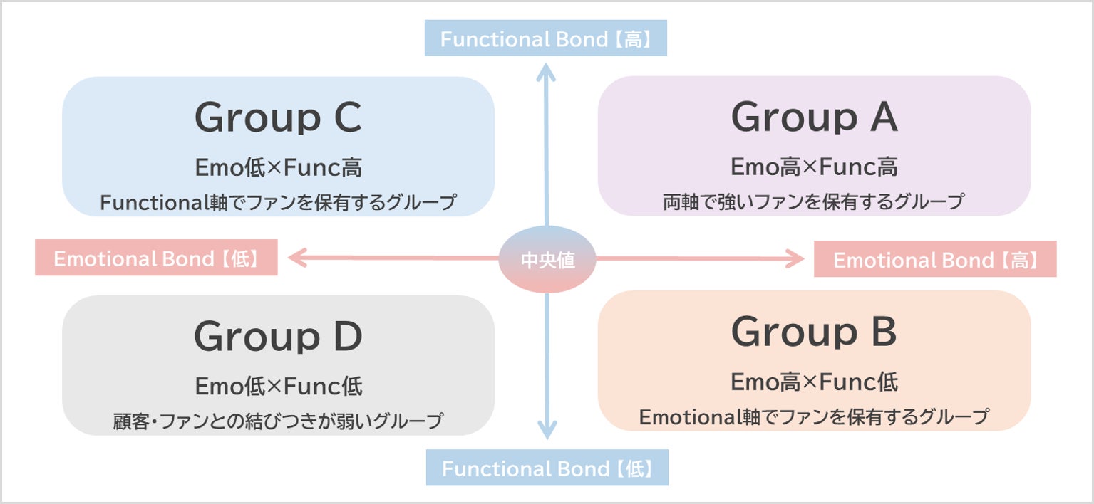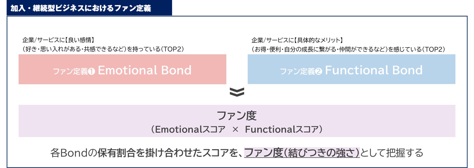 このような背景を踏まえ、加入・継続型ビジネスにおけるファン像・そしてその定義がより実態に近いものとなるよう、企業やサービスとの情緒的な結びつきである「Emotional Bond(横軸)」と、実利・機能価値享受による結びつきである「Functional Bond(縦軸)」の2つの要素を用い、ファンの定義を行いました。また、この2つの軸のスコアの掛け合わせにより、ファン度(顧客と企業との結びつきの強さ)を表します。