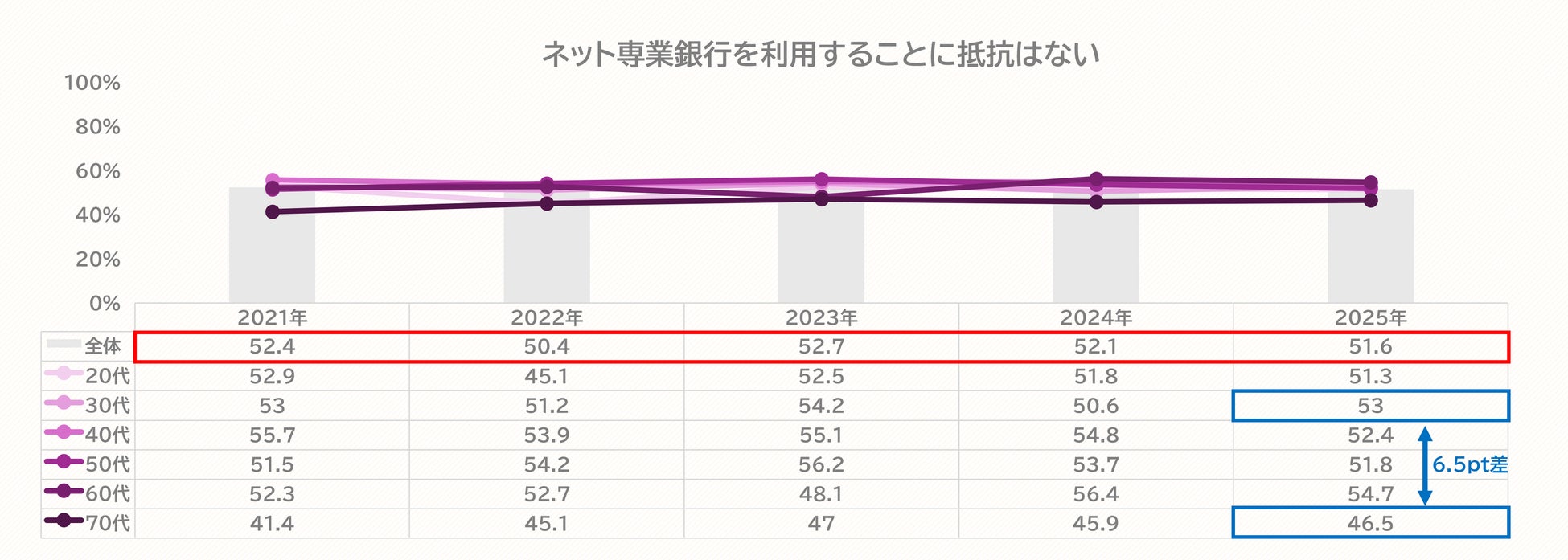 銀行のデジタル化が“当たり前”になりつつある一方で、「ネット専業銀行を利用することに抵抗はない」と回答したのは、全体で51.6%となり、ここ5年は横ばいとなっています。最も抵抗を感じている70代が46.5%、感じていないのが30代53.0%で、その差もわずか6.5ポイントと年代による差はあまりない結果となりました。