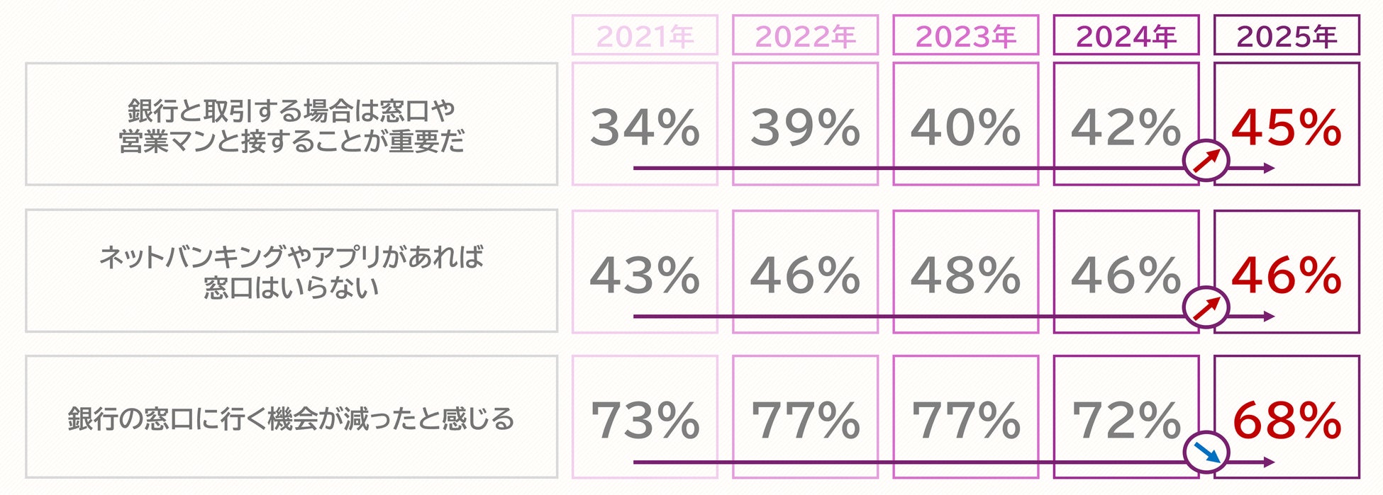 銀行窓口に関して、「銀行と取引する場合は窓口や営業マンと接することが重要だ」と回答された割合は、2021年より11ポイント増加しました。