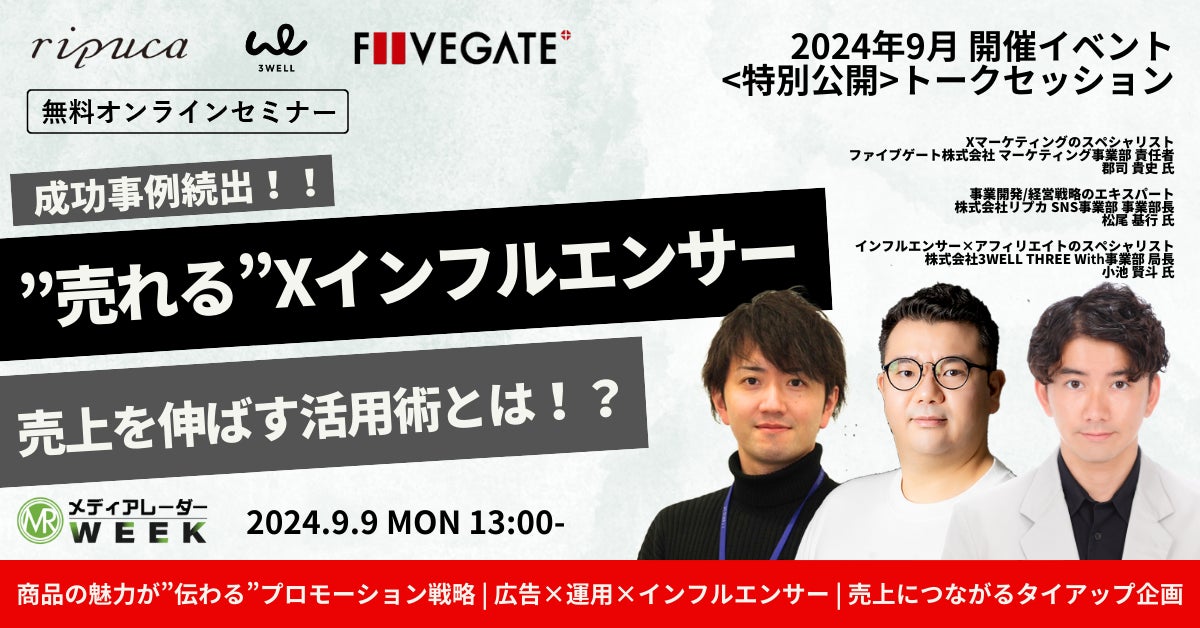 株式会社アイズ(所在地:東京都渋谷区、代表取締役社長:福島範幸、東証グロース:5242)が運営するNo.1*の広告業界のプラットフォーム「メディアレーダー」が主催するマーケティングセミナーイベント「第15回メディアレーダーWEEK 2024 秋」にて、「SNSマーケティング」のエキスパート、株式会社ファイブゲート様が9/9(月)に登壇します。視聴申し込みは無料です。
