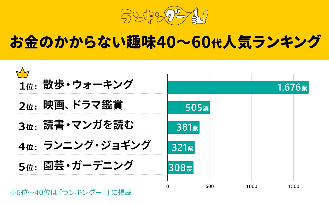 ランキングー!では40~60代の方に人気のお金のかからない趣味をピックアップし、ランキングを調査。40代以上の男女(性別回答しないを含む)8,444名にアンケートを行い、TOP40を決定しました。ここではTOP5をご紹介します。