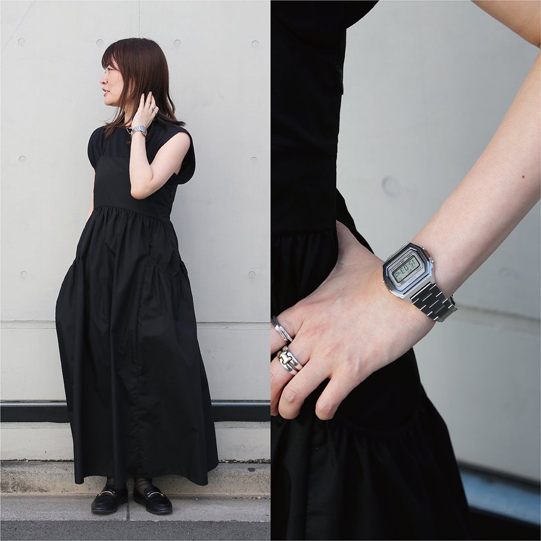 光沢を抑えたマットな質感のシルバーモデルはモノトーンコーデとの相性が良く、スタイリングを引き締めてくれる存在に。