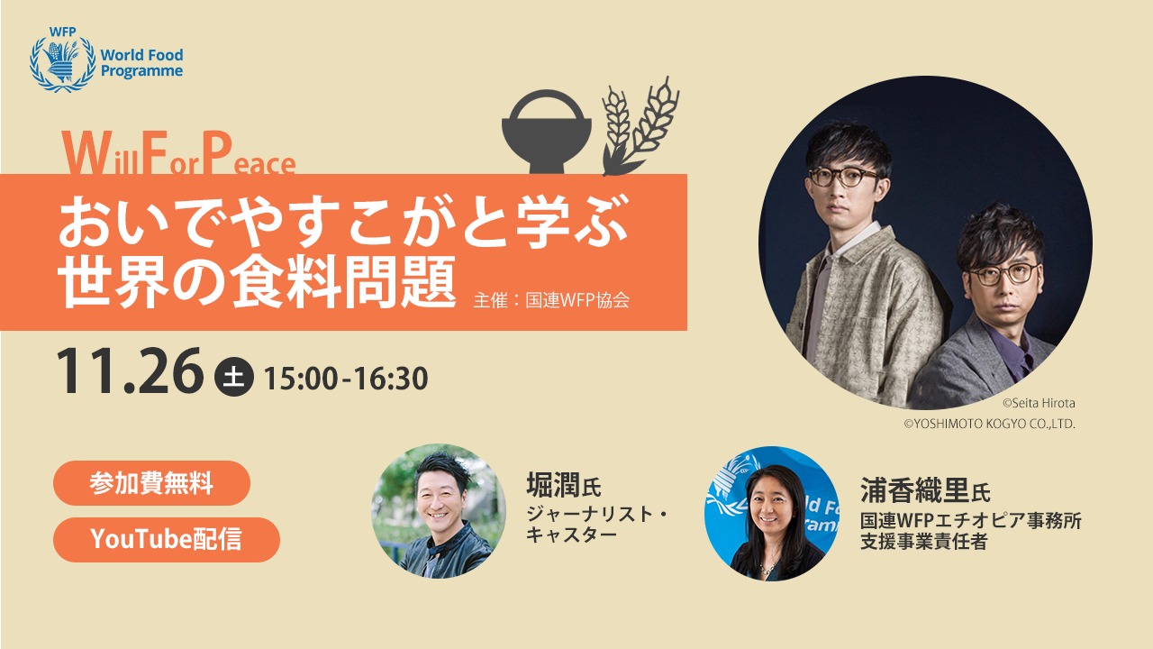 認定NPO法人国連WFP協会(横浜市)は、11/26(土)15時からオンライントークイベント「Will For Peace~おいでやすこがと学ぶ世界の食料問題~」を開催します。堀潤さんを司会にお迎えし、ゲストの人気お笑いユニットおいでやすこがさんと一緒に、世界の食料問題について学んでいきます。(配信URLはこちら: https://youtu.be/wjeJKelds9I)