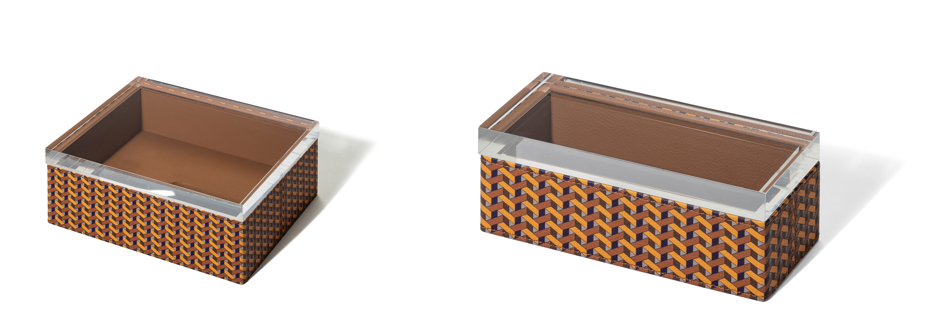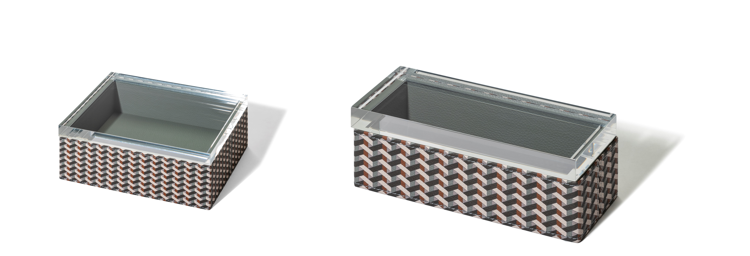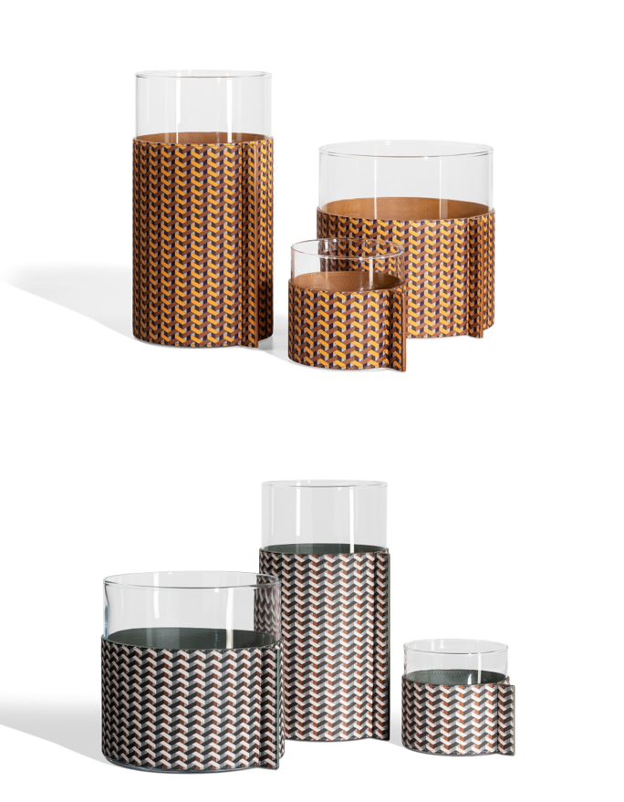 Pelle Frau®レザーを使用したフラワーベースから、レザーの表面にデジタルプリントを施した「Motif Weavers」シリーズが新たに登場。2つのカラーバリエーションを展開し、セージはグリーン、ブラウン、ブルー系の構成でクールに、シナモンは絡み合ったモチーフをあたたかみのあるカラーリングで表現しています。