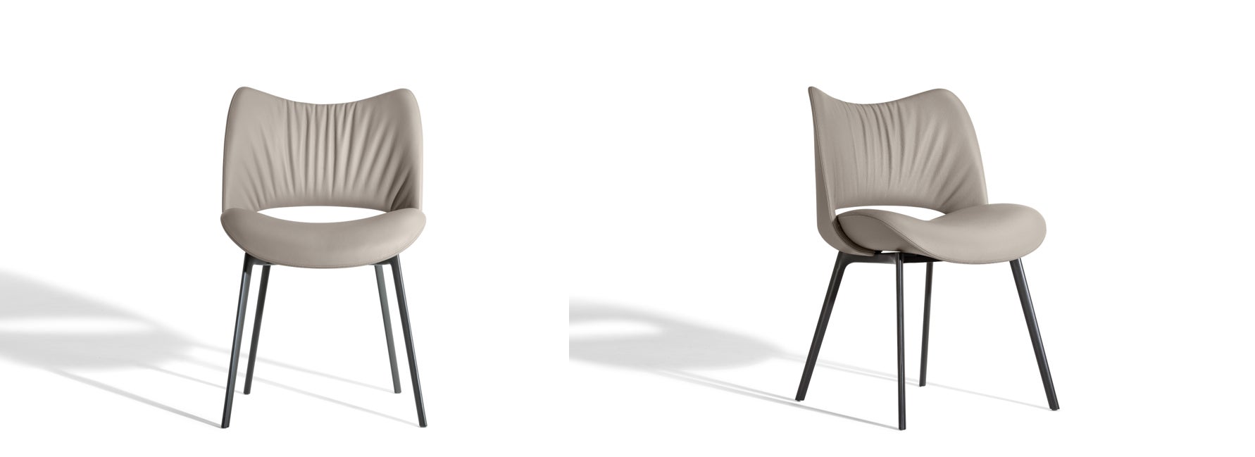 シェルが重なり合い構成された座面は、2枚の葉のようにたわみ、座る人の身体を優しく包み込みます。せわしなく過ぎる日常に安らぎのきっかけを与えるチェアです。