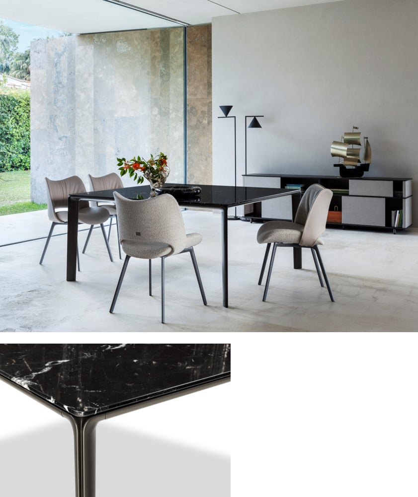 天板には大理石を使用し、彫刻のような美しいディテールで、シンプルな中に繊細な美学が宿る、ガムフラテージらしいデザインのダイニングテーブル。