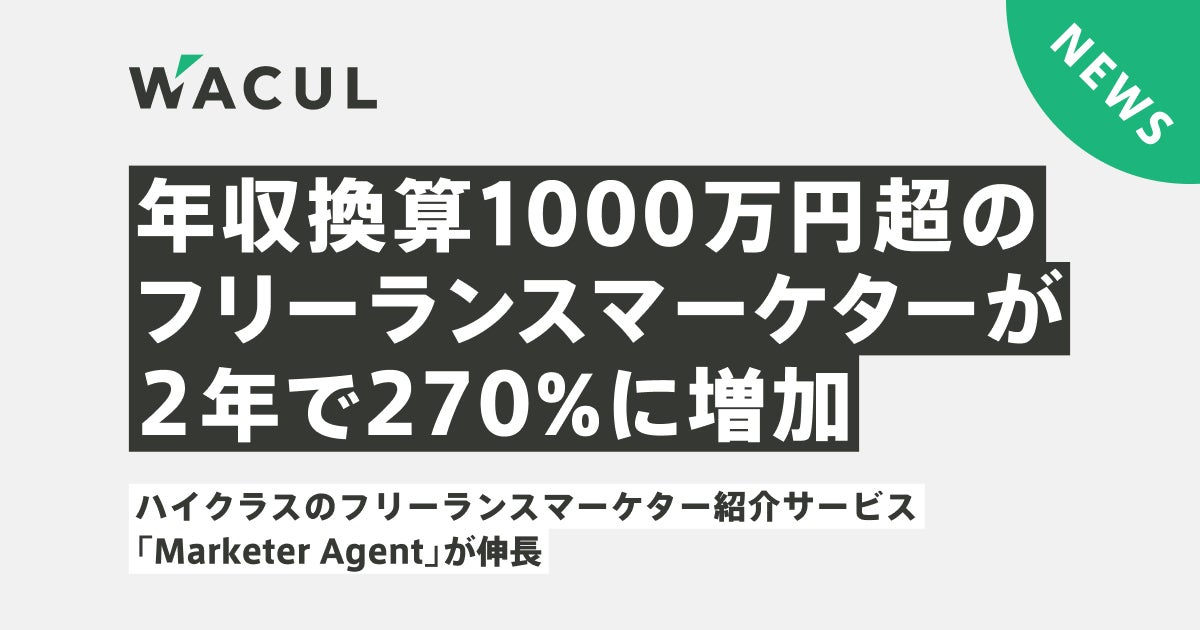 データと知見を核に、戦略から実行までマーケティングDXを一気通貫で支援する株式会社WACUL(ワカル、本社:東京都千代田区、代表取締役社長:大淵 亮平、証券コード:4173)は、ハイクラスのフリーランスマーケターに特化した紹介サービス『Marketer Agent(マーケターエージェント)』の事業において、『Marketer Agent』経由のみで"年収換算1,000万円以上"を獲得しているフリーランスマーケターが2年で270%に伸長*と好調に増加していることをお知らせします。