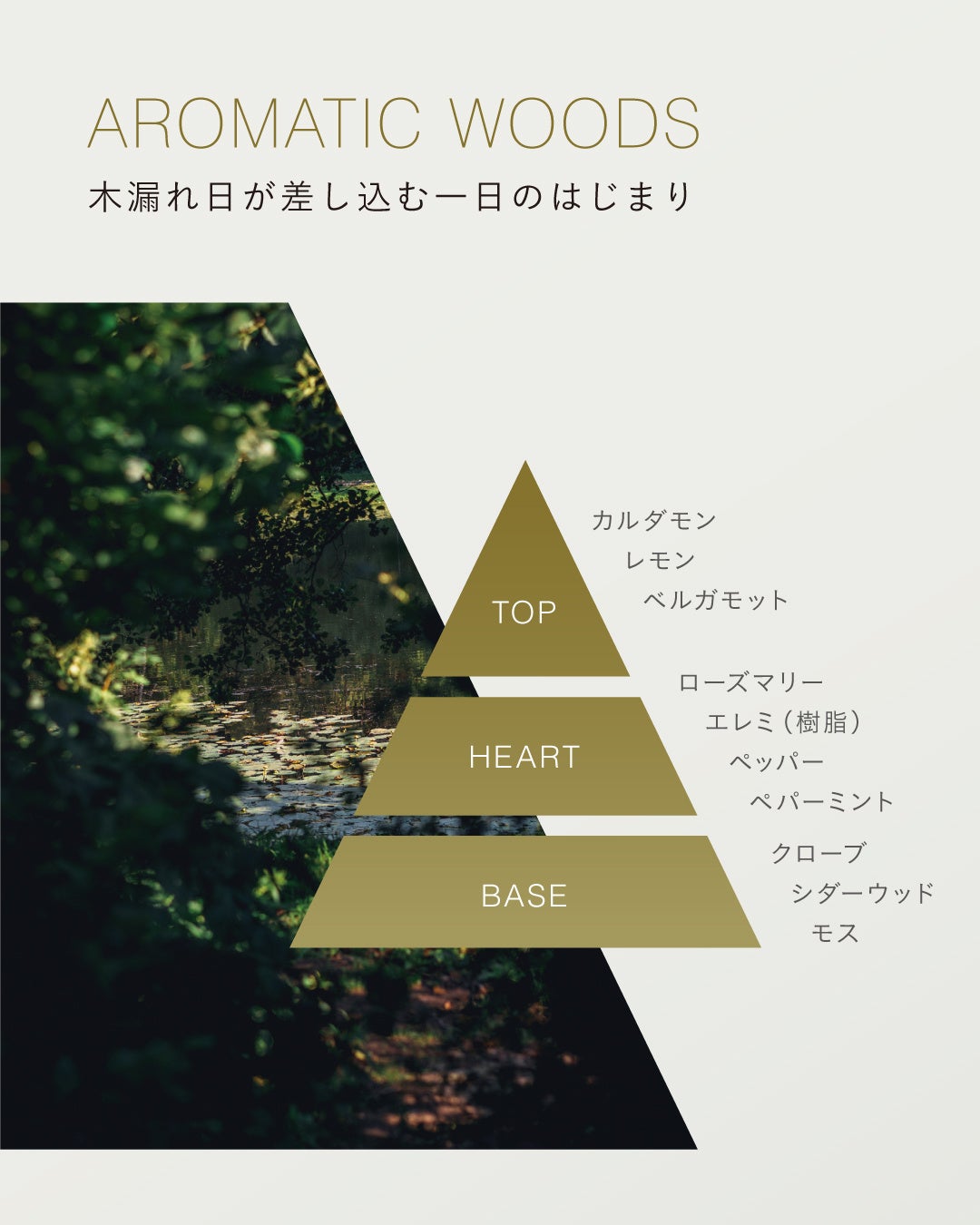 のどかな田園風景が広がるフランス・リヨンの郊外にある小さなコテージで過ごした穏やかな朝の時間。朝の陽光が降り注ぐサンルームでハーブティを片手に、静寂に身を委ねる心地よさを香りに変換してみました。爽やかなシトラスノートに、清涼感あるスパイシーなカルダモン、空気そのものを澄み渡らせるようなハーバルノート……。ラストはシダーウッドが温もりを添えて。まるで一日のはじまりに差し込む朝の光のように爽やかな香りです。