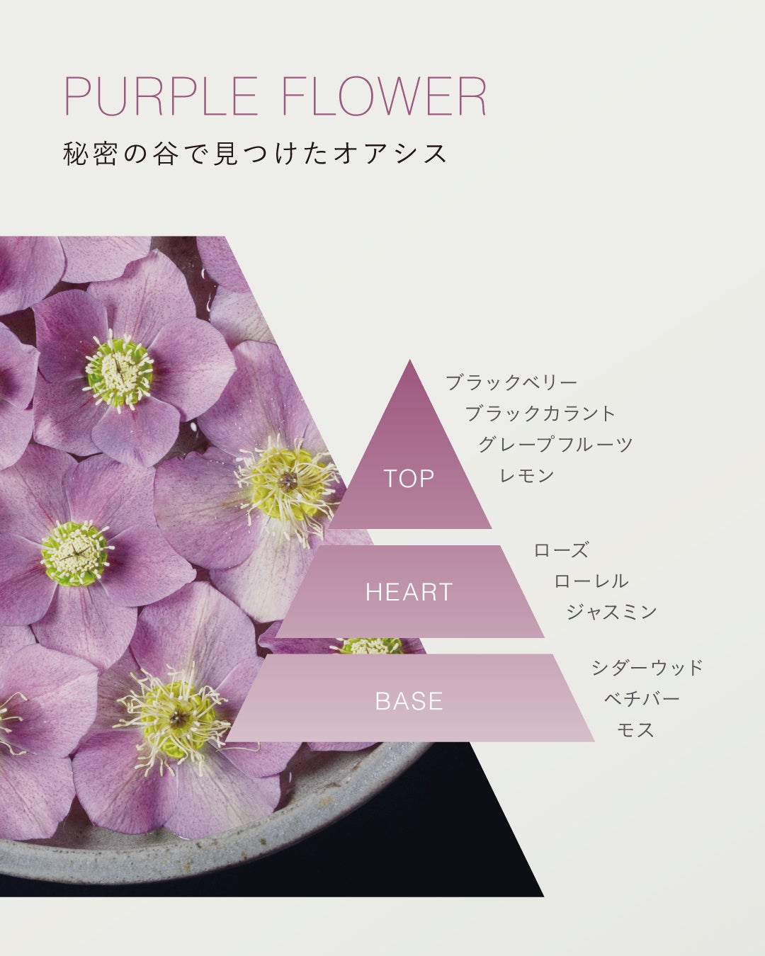 ハイキングの途中で偶然見つけた、秘密の谷。木漏れ日の差し込む谷にはスミレの花が咲き、露に濡れた草木の青い香りに包まれていました。その記憶をイメージしたこの香りは、フレッシュな酸味の中にひとさじの苦みをもつシトラスで幕を開け、野に咲く花々を思わせるフローラルアコードとほのかな甘さと木の温もりをもつ上質なサンダルウッドが溶け合い、まろやかな余韻をもたらします。日常に寄り添い、癒す小さなオアシスのような香りです。