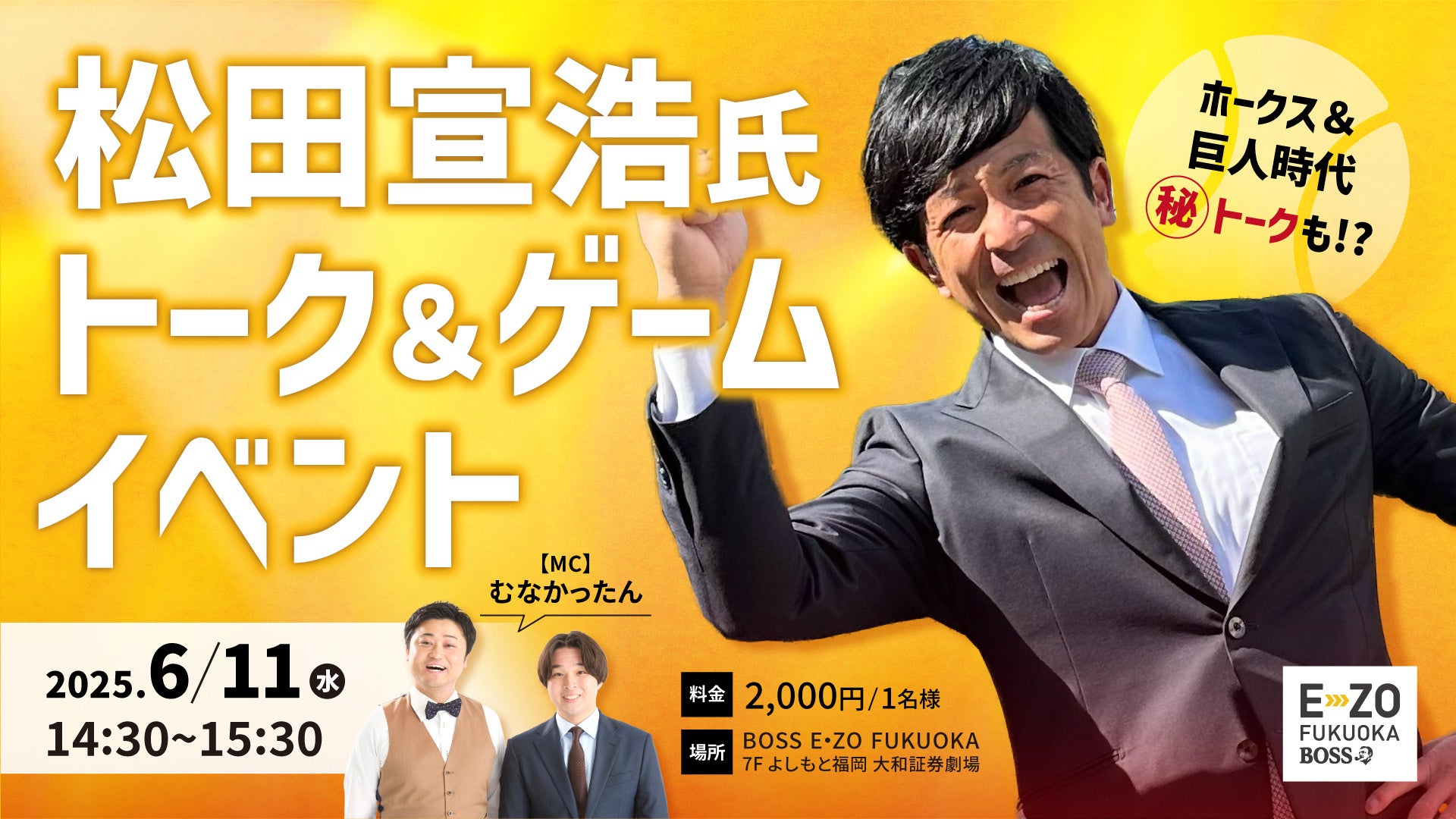 6月11日(水)の日本生命セ・パ交流戦読売ジャイアンツ戦試合日に、ホークス・巨人両球団OB松田宣浩氏のトーク&ゲームイベントを、よしもと福岡 大和証券劇場にて開催します!