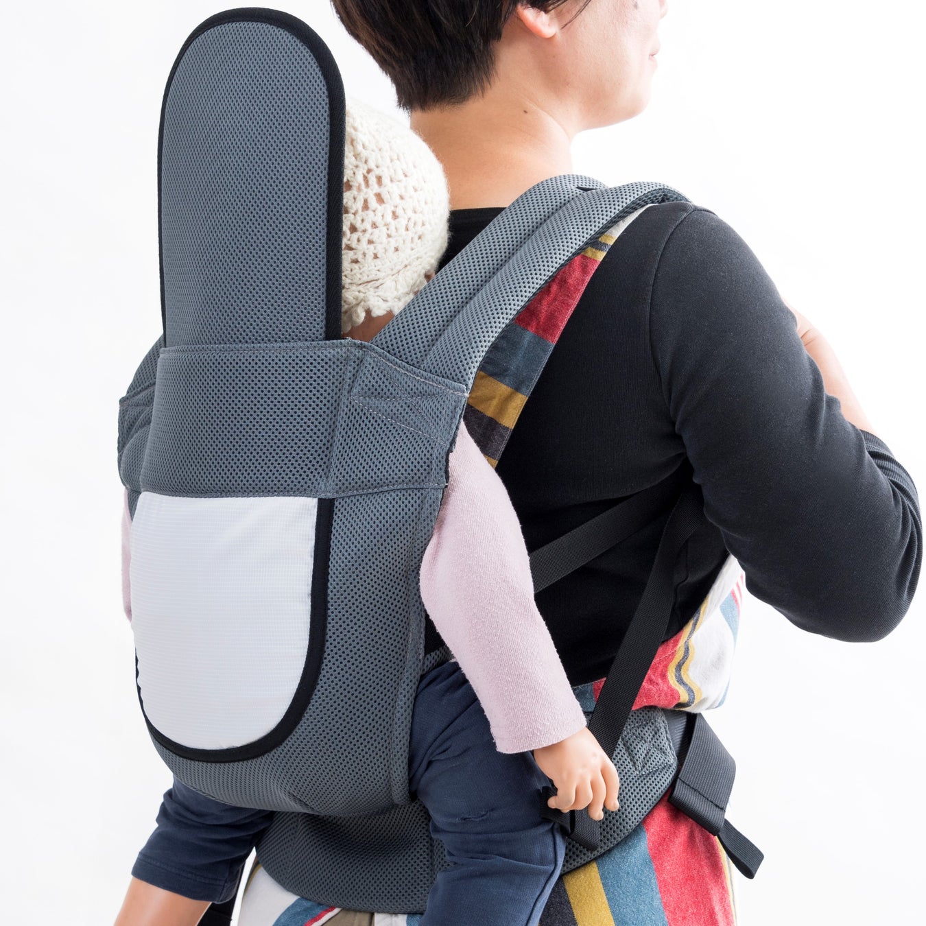 3) おんぶ時、背中側の子どもの首や頭が保護されていると安心できるという現場の声をもとに、しっかりとした背あてを付属につけました。これにより、安心して子どもをおんぶすることができます。