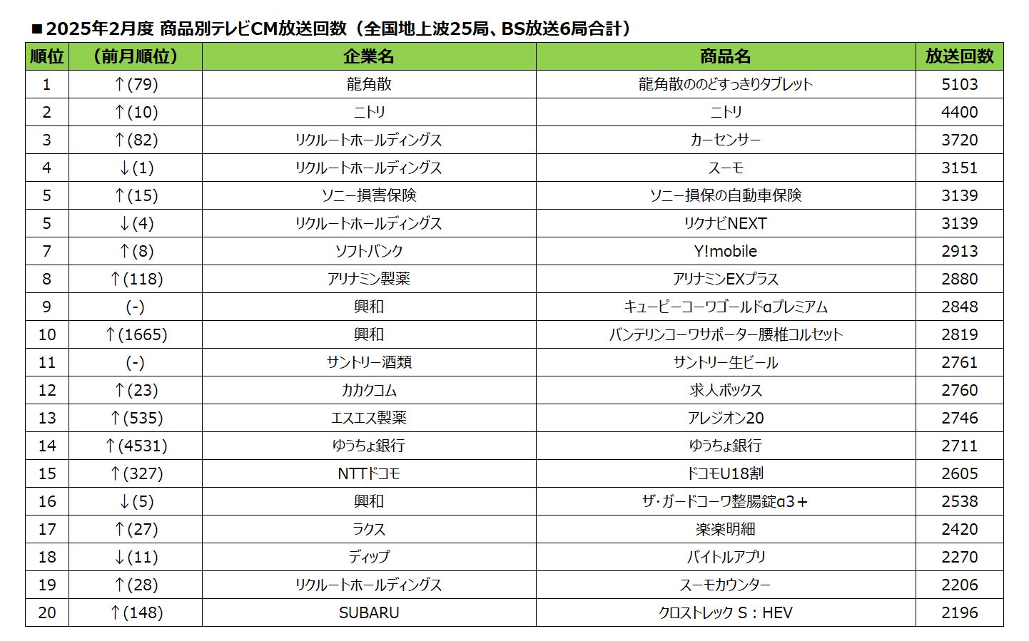 2025年2月度の商品別ランキングは、1位に龍角散「龍角散ののどすっきりタブレット」、2位にニトリ「ニトリ」がそれに続きました。リクルートホールディングスのCMが多岐にわたり上位にランクインし、特にカーセンサーやスーモといったサービスが顕著な露出を見せています。