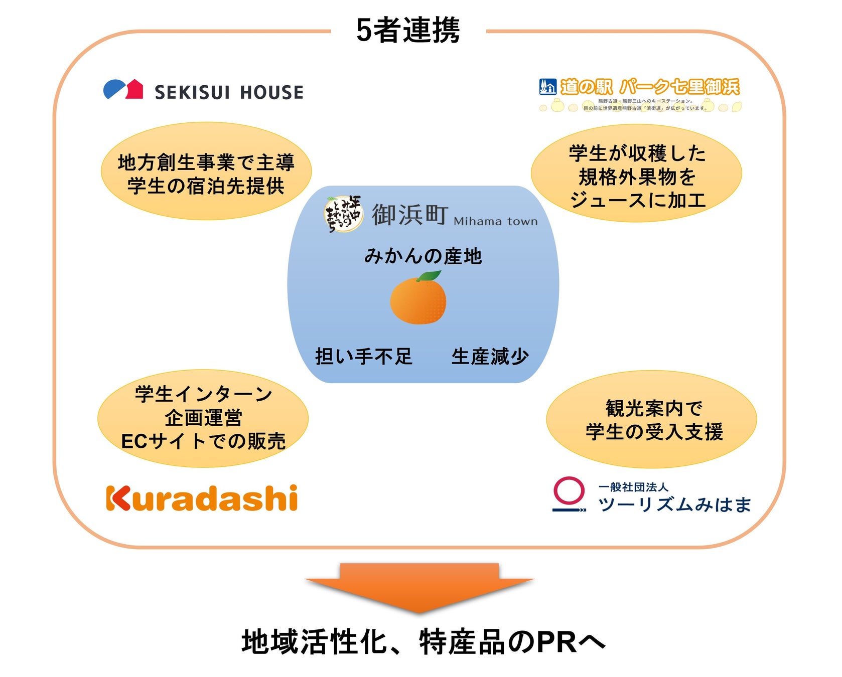 このたび、御浜町のみかん産業の再生と地域の活性化を目指し、御浜町、パーク七里御浜、ツーリズムみはまと、観光を起点に地域経済の活性化を目指す積水ハウス、地域の課題解決に取り組むクラダシの5者が連携協定を締結する運びとなりました。