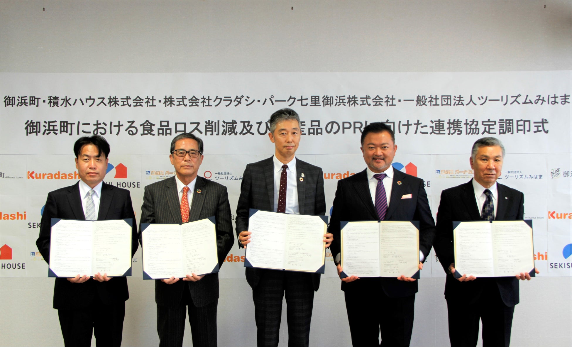 三重県御浜町、積水ハウス株式会社、株式会社クラダシ、パーク七里御浜株式会社、一般社団法人ツーリズムみはまの5者は、「御浜町における食品ロス削減及び特産品のPRに向けた連携協定」を11月28日に締結しました。積水ハウスとマリオット・インターナショナルが推進する地方創生事業「Trip Base 道の駅プロジェクト」の地域活動の取り組みとして、積水ハウスが協定締結の主導を行いました。このたびの連携により「Kuradashi」での商品の販売や、各者からの発信を通したフードロス削減に対する消費者の意識の向上に加え、担い手不足による未収穫産品の解消や不揃い、傷があるなどの規格外果実の加工によるフードロスの削減、一次産業における消費行動への変容を促すこと及び、御浜町の特産品PRと地域活性化を目指します。