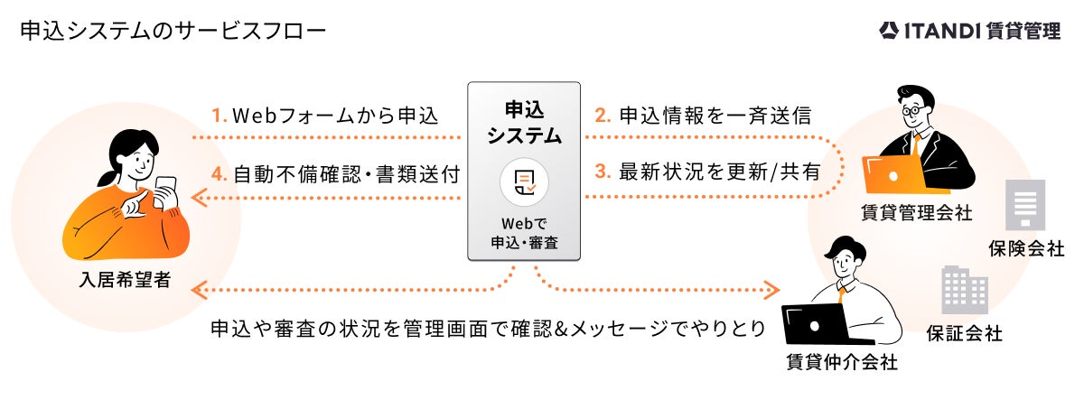 また、賃貸不動産仲介会社および賃貸不動産管理会社(以下「仲介会社」「管理会社」)が入居者へ手続きのご案内をする際は、「ITANDI 賃貸管理」からワンクリックで行えるようになり、さらなる業務効率化を実現できます。