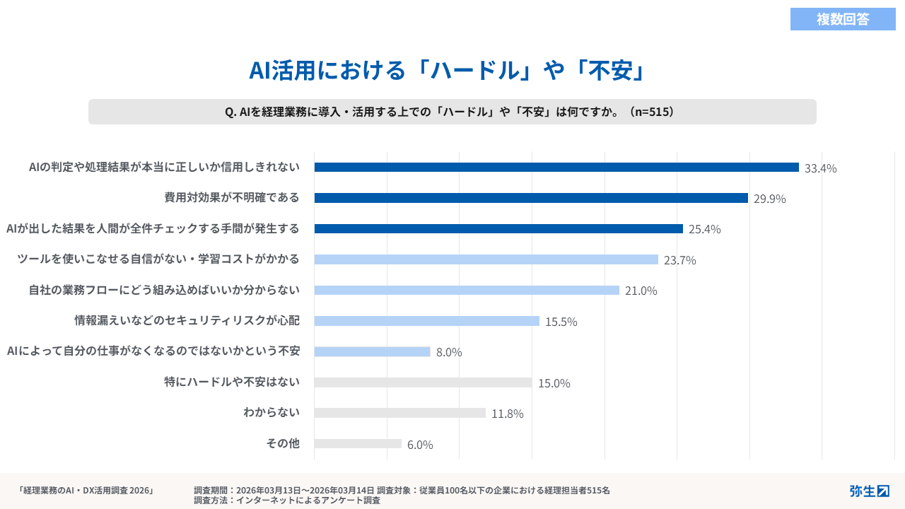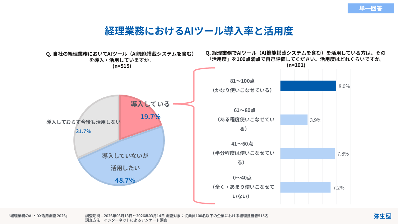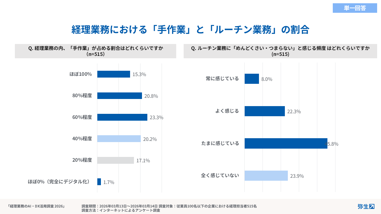 弥生株式会社(本社:東京都千代田区、代表取締役 社長執行役員 兼 CEO:武藤健一郎、以下「弥生」)は、年度末を迎え、多くの企業で経理の役割や重要性があらためて意識される3月31日を「経理の日」として制定しています。その制定社である弥生は、「経理の日」にあわせ、経理業務を取り巻く環境や意識がどのように変化しているのかを明らかにするため、従業員100名未満の中小企業に勤める経理担当者515名を対象に、「経理業務のAI・DX活用に関する実態調査」を実施しました。