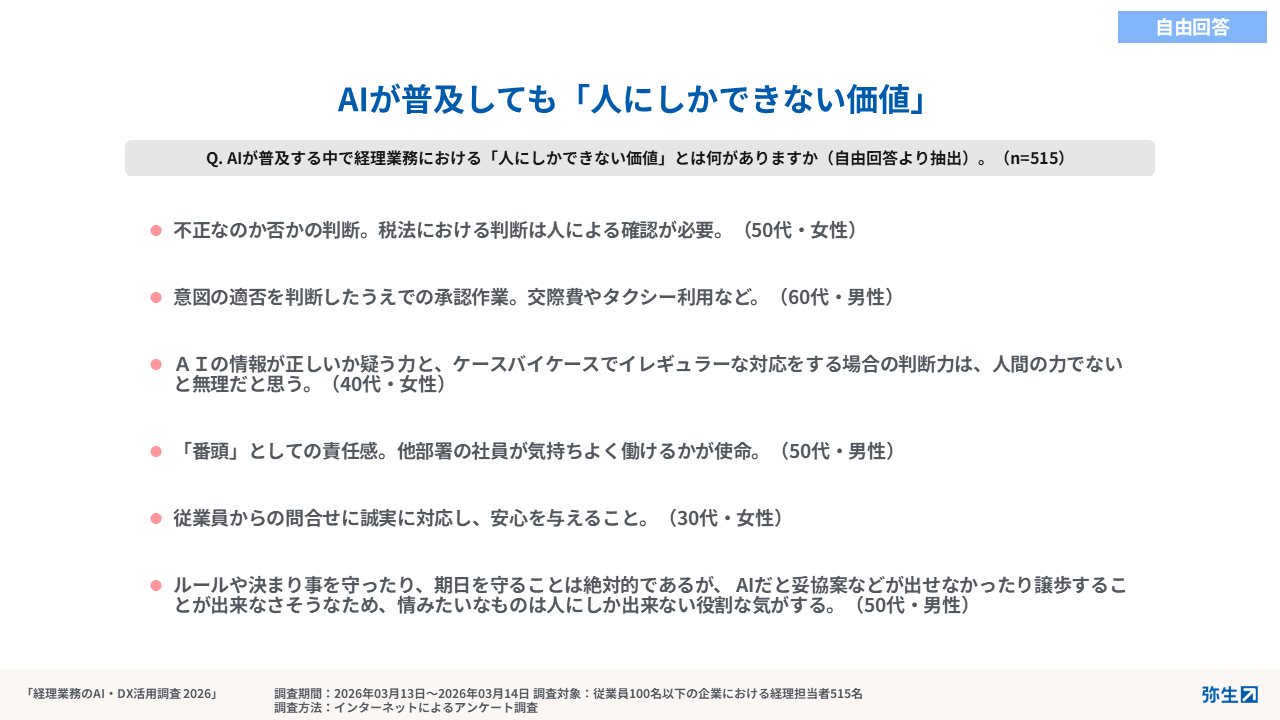 自由回答では、不正の有無や税務判断などの法令解釈を伴う領域や、交際費・経費精算における利用目的や背景を踏まえた承認判断、イレギュラー時の対応など、単なるルール適用では判断できない領域こそが人の役割であるという認識が多く見られました。また、AIの判断や提案をそのまま受け入れるのではなく、「その情報は本当に正しいのか」を見極め、最終責任を担う存在として人が関与する必要性を指摘する声も挙がっています。