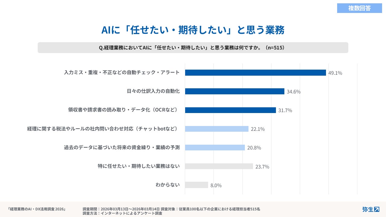 AIに期待されるのは入力チェックや仕分の自動化などの定型業務であり、法令解釈やイレギュラー対応、責任を伴う判断は「人の役割」と考える経理担当者が多い。 -