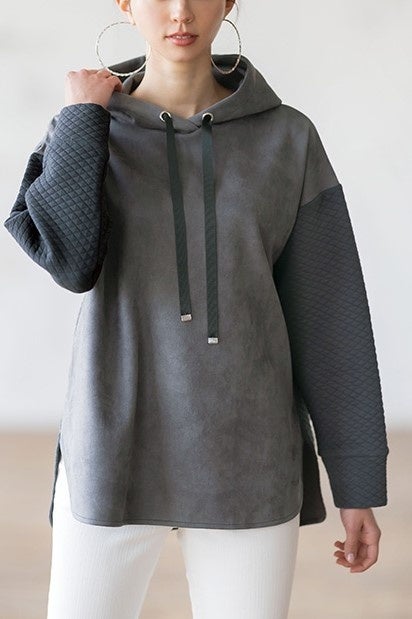 トレンドのキルティングとスエードの異素材を組み合わせた大人フードパーカー。