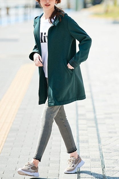 フード紐にリボンが上品見えする旬なデザインアイテムです。