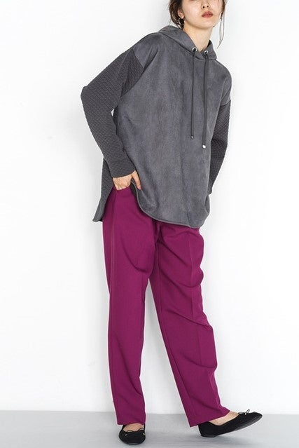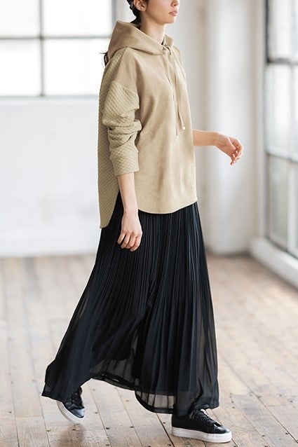 「スエードコンビキルティングパーカー」は、ラフなイメージのあるパーカーでありながら大人っぽい着こなしができるきれい見えアイテム。前身頃とフードはフェイクスエード、後ろ身頃と袖はトレンドのキルティングといった異素材を組み合わせることで、デザインに一工夫加えました。上品な印象を与えるフード紐のリボンもポイント。旬なコーディネートを実現する今季のマストアイテムです。